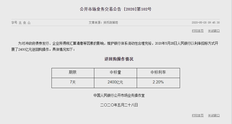 央行解釋稱,開展2400億元逆回購操作是為對沖政府債券發(fā)行、企業(yè)所得稅匯算清繳等因素的影響,維護銀行體系流動性合理充裕。此次中標利率依然與上次持平,仍為2.20%,期限為7天。