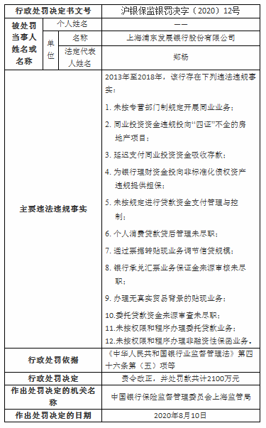 根據(jù)《中華人民共和國銀行業(yè)監(jiān)督管理法》第四十六條第(五)項等,上海銀保監(jiān)局于8月10日對浦發(fā)銀行作出行政處罰決定,責(zé)令其改正,并處罰款共計2100萬元。