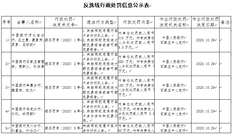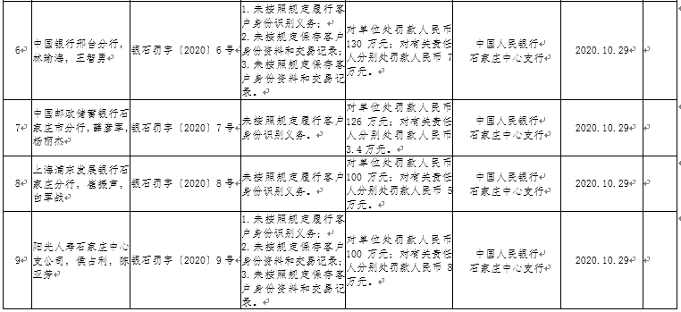 除了上述機(jī)構(gòu),公示表顯示,因中國(guó)郵政儲(chǔ)蓄銀行石家莊市分行及有關(guān)負(fù)責(zé)人未按照規(guī)定履行客戶(hù)身份識(shí)別義務(wù),監(jiān)管部門(mén)對(duì)單位處罰款126萬(wàn)元,對(duì)兩位有關(guān)責(zé)任人分別處罰款3.4萬(wàn)元;因上海浦東發(fā)展銀行石家莊分行及有關(guān)負(fù)責(zé)人未按照規(guī)定履行客戶(hù)身份識(shí)別義務(wù),監(jiān)管部門(mén)對(duì)單位處罰款100萬(wàn)元,對(duì)兩位有關(guān)責(zé)任人分別處罰款5萬(wàn)元。