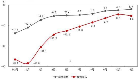 城鄉(xiāng)市場穩(wěn)定復(fù)蘇。11月份,城鎮(zhèn)和鄉(xiāng)村消費(fèi)品零售額同比分別增長4.9%和5.6%,增速分別比10月份加快0.7和0.5個(gè)百分點(diǎn),城鄉(xiāng)市場銷售均連續(xù)四個(gè)月同比正增長。11月份,鄉(xiāng)村消費(fèi)品零售額增速高于城鎮(zhèn)0.7個(gè)百分點(diǎn),鄉(xiāng)村市場恢復(fù)好于城鎮(zhèn)。