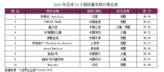 央廣網(wǎng)北京9月26日消息(記者陳璽宇)由世界企業(yè)家集團、《世界企業(yè)家》雜志、世界地產(chǎn)研究院主辦、《總裁》雜志社聯(lián)合編制并發(fā)布的2016(第七屆)《亞洲10大超級豪宅》排行榜今天揭曉,印度首富安巴尼的私人豪宅安蒂拉位居第一,香港山頂豪宅TWELVE PEAKS排名第二,上海壹公館排名第三。中國大陸其他入選的豪宅項目還有廣東深圳的東海國際公寓(第四)、天津的美墅金島(第五)、廣西南寧的凱旋1號(第八)和江蘇蘇州的融創(chuàng)·蘇州壹號院(第九)。