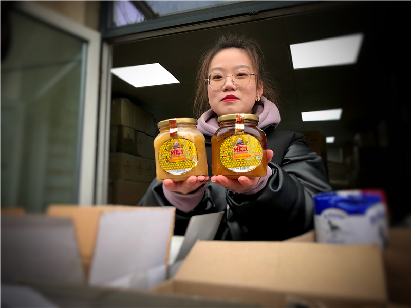 企業(yè)工作人員展示從哈薩克斯坦拉回來的蜂蜜。(莊敬平 攝 中國鐵路西安局供圖)