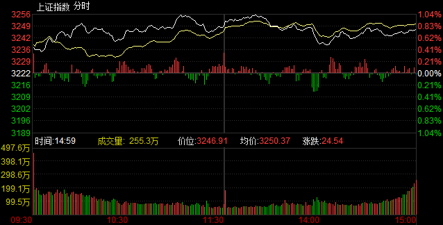 央廣網財經2月17日消息,據經濟之聲《交易實況》報道,兩市開盤小幅高開,隨后震蕩上升,滬指七連陽收官,滬指報3246.91點,上漲24.54點,漲幅0.76%,成交2633億元;深成指報11718.5點,上漲123.31點,漲幅1.06%,成交2494億元;創(chuàng)業(yè)板指報1894.31點,下跌2.32點,跌幅0.12%,成交549.3億元。