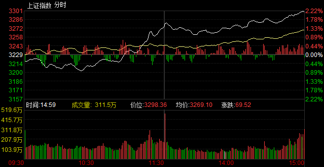 收盤:權(quán)重股井噴滬指漲2.15% 上望3300點