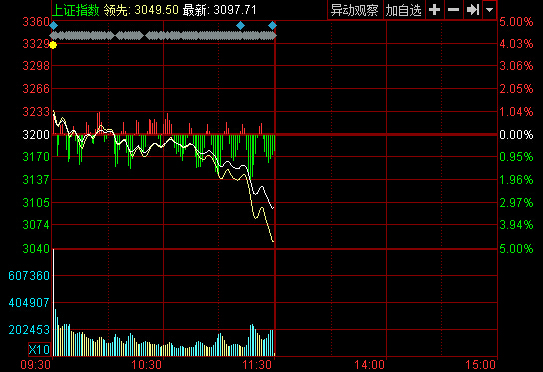 截止午盤,滬指報(bào)3097.71點(diǎn),跌102.52點(diǎn),跌幅3.20%;深成指報(bào)9994.34點(diǎn),下跌469.35點(diǎn),跌幅4.49%;創(chuàng)業(yè)板報(bào)1937.28點(diǎn),下跌123.22點(diǎn),跌幅5.98%。