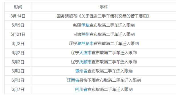 因此,今年3月,國務院發(fā)布《關(guān)于促進二手車便利交易的若干意見》,明確要求除有特殊要求的城市外,其他省市要在5月底徹底完成解除限遷的落地實施。