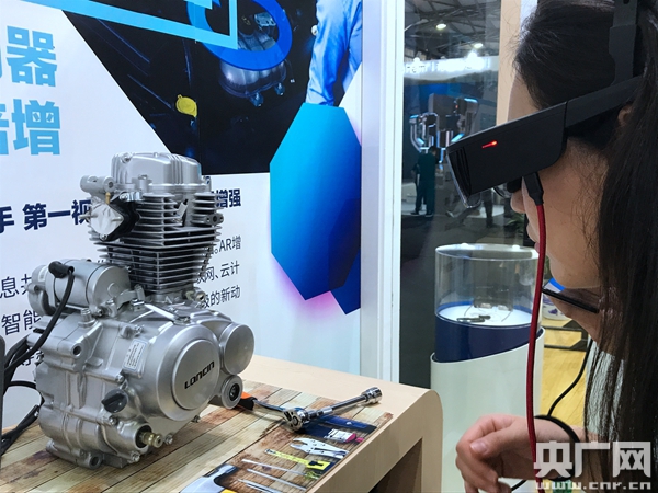 在亮風(fēng)臺公司的展臺前,一個摩托車發(fā)動機格外引人注目,F(xiàn)場工作人員任崇斌介紹,維修人員工作時戴上亮風(fēng)臺AR眼鏡,摩托車發(fā)動機的產(chǎn)品信息、零部件結(jié)構(gòu)就能清晰地疊加在現(xiàn)實場景之上!拔覀兛梢栽诂F(xiàn)實中疊加顯示它的內(nèi)部結(jié)構(gòu)和工作原理,可以選擇各個模塊讓它告訴我們每個零部件的名字。如果在維修的過程中遇到了問題,可以申請遠程協(xié)助。這些全都是戴著眼鏡在操作,可以達到解放雙手的目的!