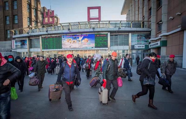 返鄉(xiāng)務(wù)工人員離開(kāi)火車(chē)站前往站內(nèi)客車(chē)乘車(chē)點(diǎn)(中鐵哈爾濱局供圖)