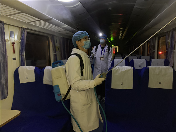 工作人員對每輛車進行消毒,經(jīng)常工作到凌晨(央廣網(wǎng)發(fā) 中國鐵路成都局供圖)