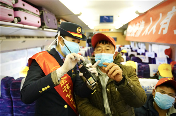 乘務(wù)人員為乘客測量體溫,當日,近500名云南籍務(wù)工人員乘坐專列前往廣州(央廣網(wǎng)發(fā) 中國鐵路昆明局供圖)