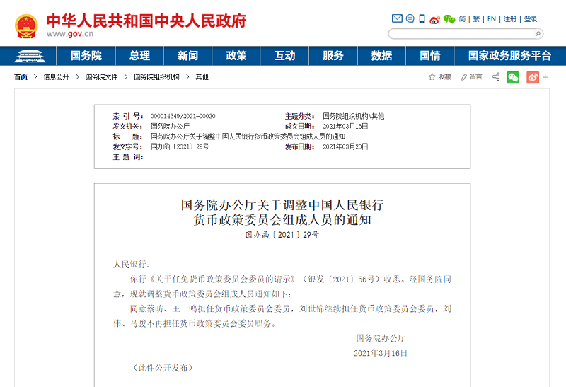 央廣網(wǎng)北京3月23日消息(記者蔣勇)據(jù)中央廣播電視總臺(tái)經(jīng)濟(jì)之聲《天下財(cái)經(jīng)》報(bào)道,國(guó)務(wù)院辦公廳近日發(fā)布通知,同意中國(guó)社會(huì)科學(xué)院國(guó)家高端智庫(kù)首席專家蔡昉、中國(guó)國(guó)際經(jīng)濟(jì)交流中心副理事長(zhǎng)王一鳴擔(dān)任貨幣政策委員會(huì)委員,中國(guó)發(fā)展研究基金會(huì)副理事長(zhǎng)劉世錦繼續(xù)擔(dān)任貨幣政策委員會(huì)委員,中國(guó)人民大學(xué)校長(zhǎng)劉偉、清華大學(xué)金融與發(fā)展研究中心主任馬駿不再擔(dān)任貨幣政策委員會(huì)委員職務(wù)。