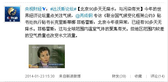 #達沃斯論壇#【北京90多天無降水:與污染有關(guān)】今年的世界經(jīng)濟論壇重點關(guān)注氣候,@芮成鋼專訪《聯(lián)合國氣候變化框架公約》秘書處執(zhí)行秘書長克里斯蒂娜·菲格雷斯:北京今年很異常,已經(jīng)有90多天無降水。菲格雷斯:這與全球范圍內(nèi)溫室氣體的聚集有關(guān)。但地區(qū)范圍內(nèi)較差的空氣質(zhì)量也改變水文流量。