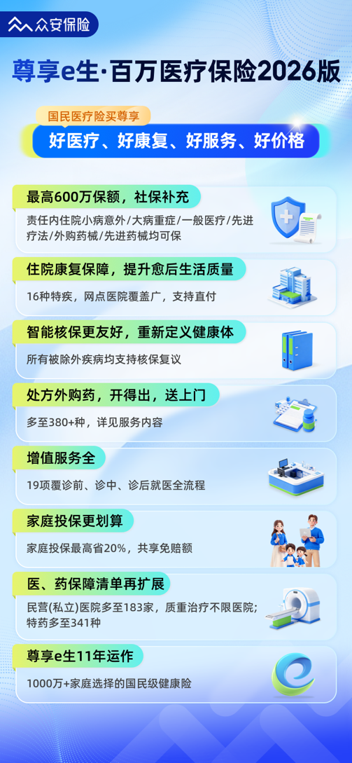 在基本醫(yī)療保障體系持續(xù)深化改革的背景下,商業(yè)健康險作為重要補充,其價值將更多體現(xiàn)在整合醫(yī)療資源、優(yōu)化服務流程等方面,從而滿足患者全周期、多層次的實際保障需求。此次“尊享e生2026版”的升級不僅是單一產(chǎn)品保障與服務的拓展,也代表眾安保險未來在尊享系列產(chǎn)品的設計中將持續(xù)回應患者需求,在產(chǎn)品創(chuàng)新上深入至對患者康復質(zhì)量與健康結果的切實關注。