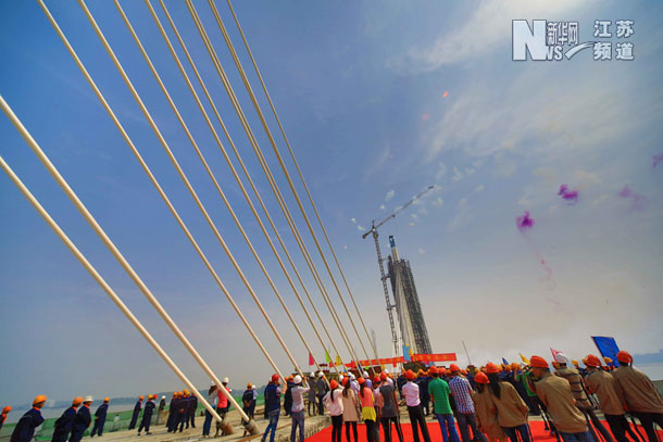 建設(shè)者們慶祝如皋長江大橋合龍。