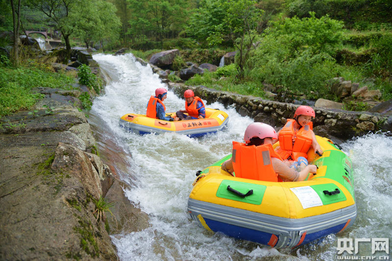 當(dāng)天下午1點(diǎn)多鐘,各地游客紛涌而至,大家穿上泳衣爭先恐后地坐上皮筏艇,體驗(yàn)水上極速的樂趣。在河道中,皮筏艇一個(gè)接著一個(gè)從上游漂下,游客們一路尖叫一路歡笑,讓人心跳加速,大家盡情地享受著河水帶來的清涼,大呼過癮。來自陜西的陶女士漂完全程后,開心地說:“婺源不僅風(fēng)景很美,漂流也非常的刺激過癮,不虛此行!