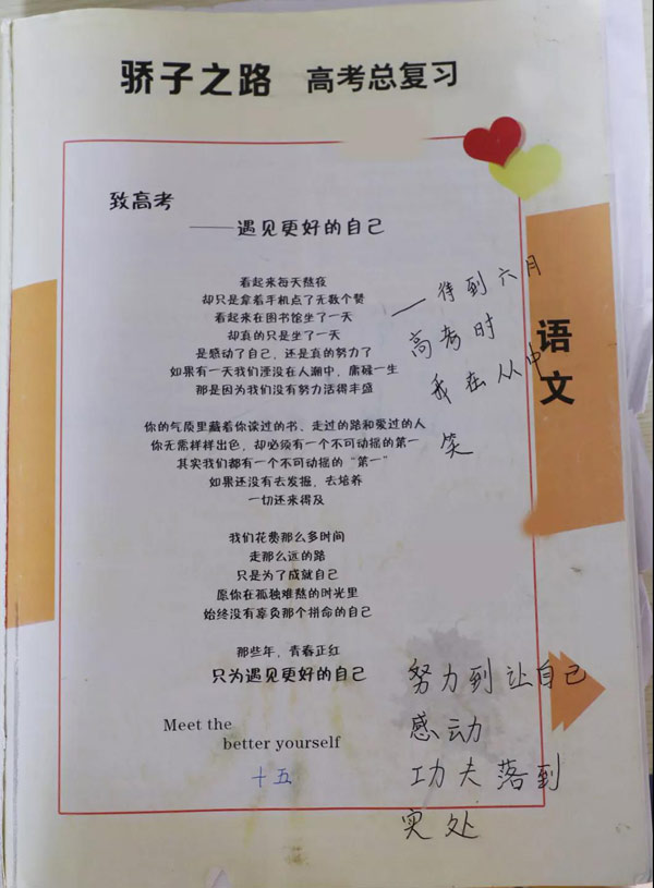 為了高考,小姑娘準(zhǔn)備了很久,在她練習(xí)冊的第一頁,她寫下了“待到六月高考時(shí),我在叢中笑”和“努力到讓自己感動(dòng),功夫落到實(shí)處!倍@樣的情況,不僅讓她自己也讓她家人和老師不知所措。