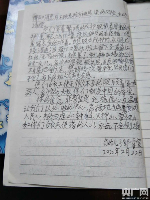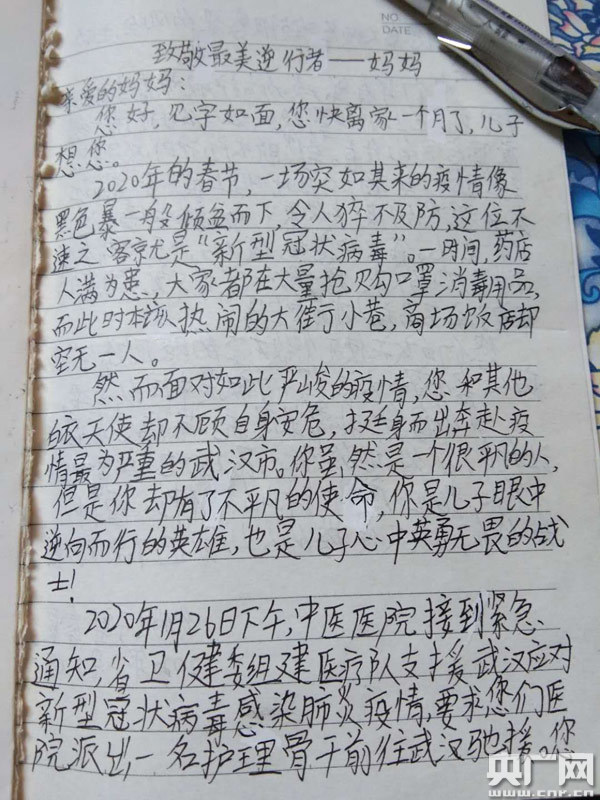 周僉說,看了孩子寫的信,她非常感動,也非常感激學(xué)校和老師的付出,覺得兒子突然長大了。她說,我們這個時代沒有從天而降的英雄,只有挺身而出的我們,作為白衣天使,馳援武漢、救死扶傷是她的天職,她將繼續(xù)為打贏疫情防控阻擊戰(zhàn)竭盡所能。