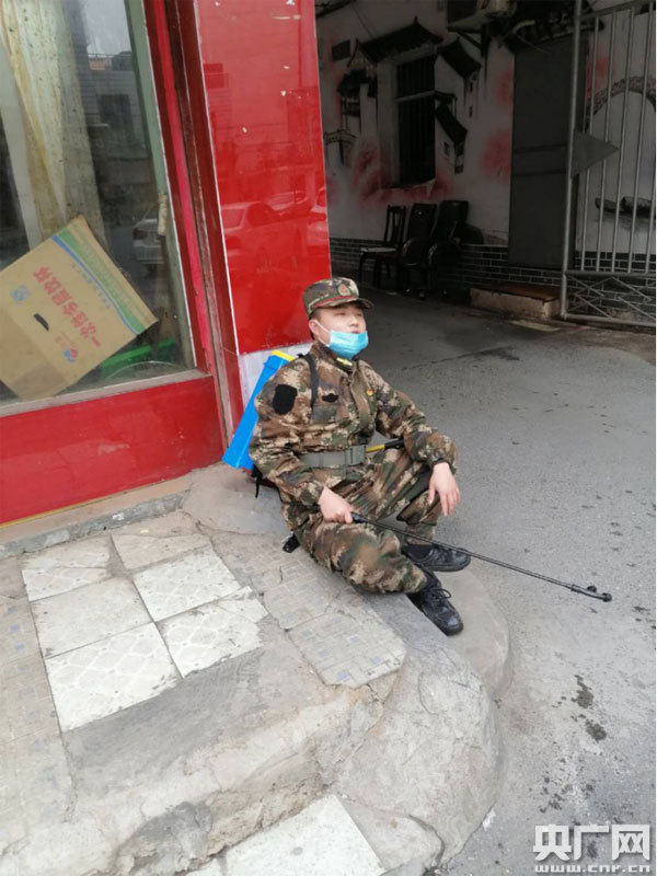 廖屹杰消殺完一棟樓后靠墻休息一會兒