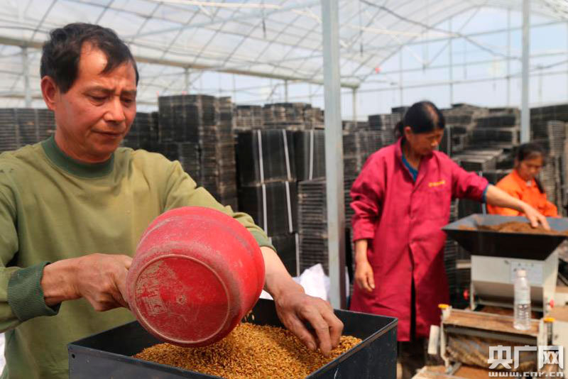 偉鳳合作社育秧大棚內(nèi)工人流水線作業(yè)