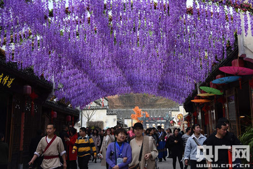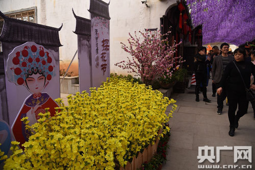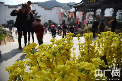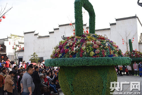 陽(yáng)春三月,婺源夢(mèng)里老家舉辦“探花節(jié)”,五彩繽紛的花朵把廣場(chǎng)、街道裝扮一新,吸引了眾多游客前來(lái)賞花游玩。圖為3月15日,游客在婺源夢(mèng)里老家用五彩繽紛花朵裝扮一新的“花街”參觀游覽。(央廣網(wǎng)發(fā) 通訊員單長(zhǎng)華攝)