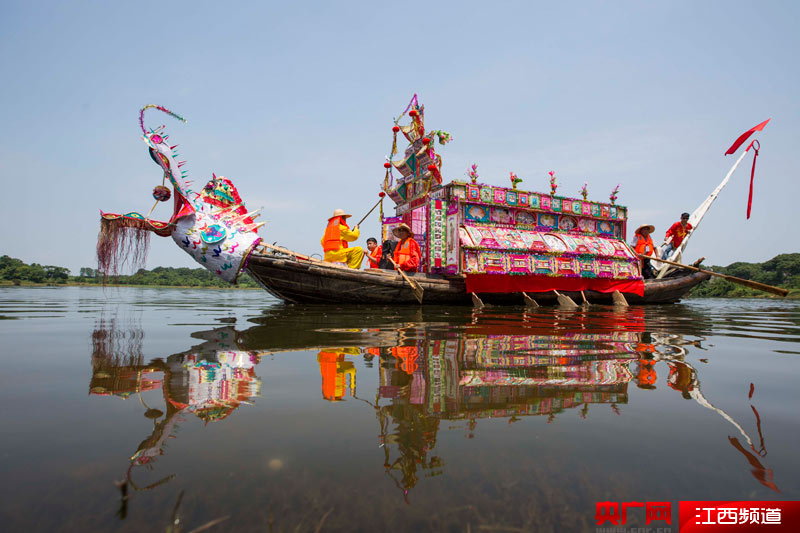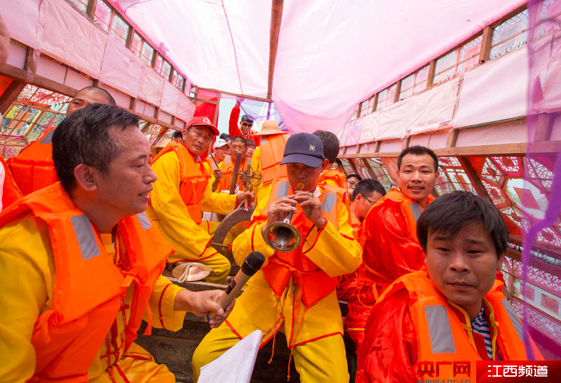 6月14日,在江西都昌縣南峰鎮(zhèn)白水村,民間藝人在龍船上表演龍船調(diào)。