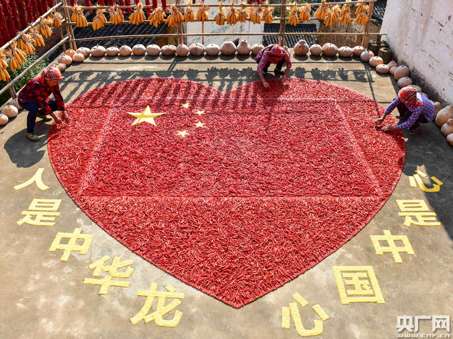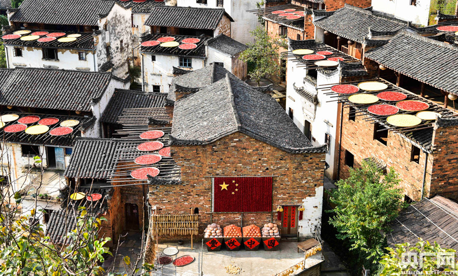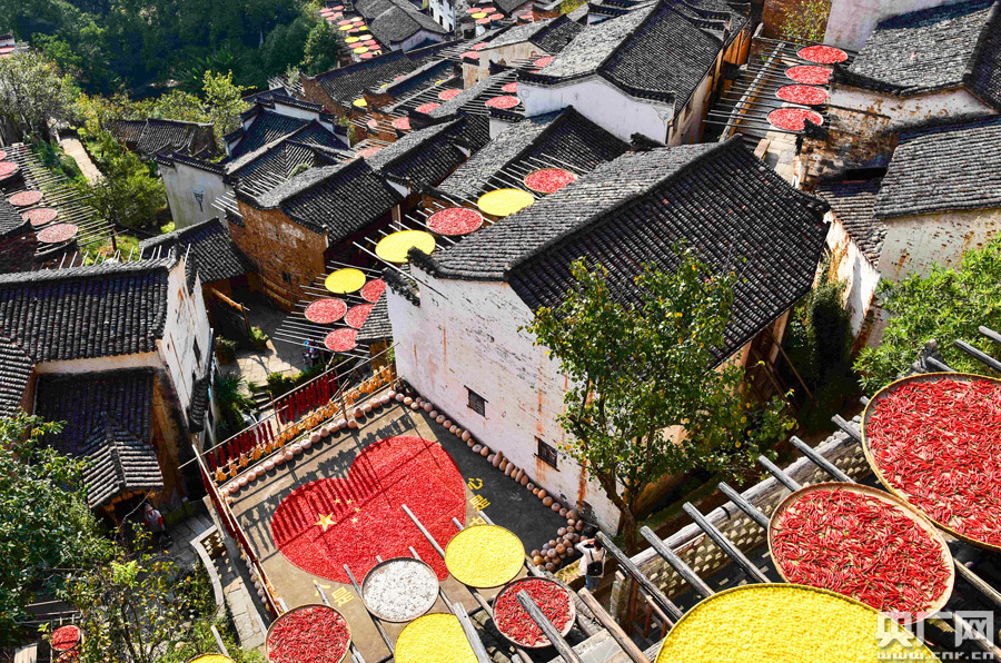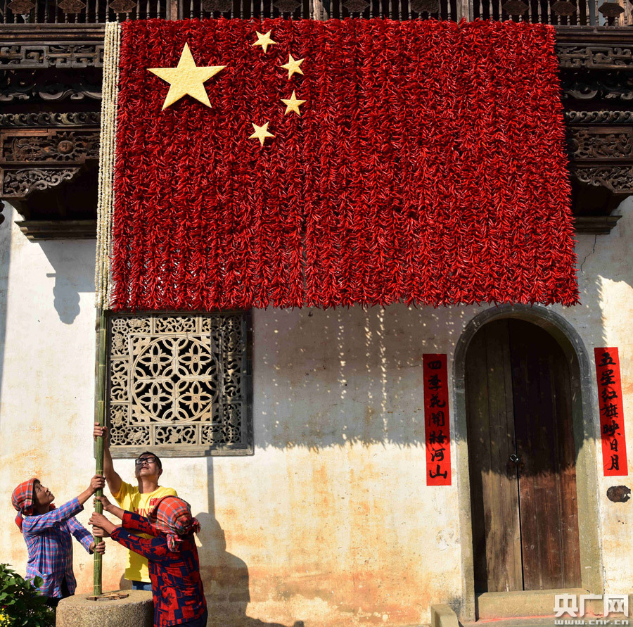 2019年9月30日,江西省婺源縣篁嶺古村處處洋溢著濃濃的愛國氛圍,農(nóng)家大媽用辣椒、玉米等農(nóng)作物在窗臺、曬臺等擺出一個(gè)個(gè)“國旗”圖案,喜迎新中國成立70周年。(央廣網(wǎng)發(fā) 通訊員 曹加祥 攝)