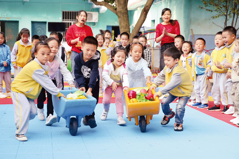 江西堅持以人民為中心的發(fā)展思想,加快教育、文化、衛(wèi)生、體育等社會事業(yè)發(fā)展,更好滿足人民美好生活需要。圖為2020年10月14日,江西省峽江縣幼兒園通過參加搬運瓜果、冬瓜舉重等趣味比賽,提高孩子們熱愛勞動、愛惜糧食的意識。 人民圖片 陳福平/攝