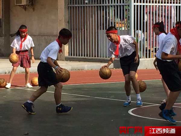 畢業(yè)典禮上,六(1)班同學再一次揮灑汗水,進行籃球對抗表演。