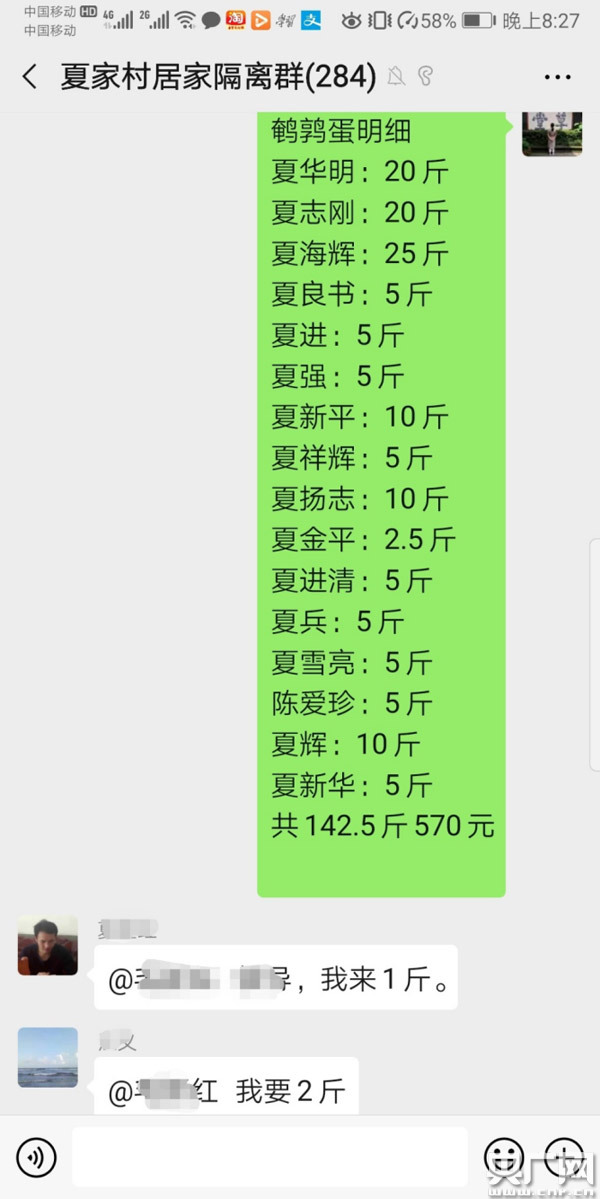 頓時(shí),同田鄉(xiāng)的婦聯(lián)工作群、機(jī)關(guān)干部工作群、疫情信息閉環(huán)工作群等近10個(gè)微信群里熱鬧了起來(lái):“可以送貨上門嗎?行的話來(lái)20斤!薄拔乙褰铩薄ⅰ拔沂程美镆60斤”....隨著一條條信息推出,下單的也接連不斷,聽(tīng)說(shuō)是貧困戶家的鵪鶉蛋積壓,不少干部在自己的朋友圈也轉(zhuǎn)發(fā)起來(lái)。夏家村的居家隔離群更是接起了長(zhǎng)龍,短短一個(gè)小時(shí),就有20多戶村民訂購(gòu)了近150斤鵪鶉蛋。在大家的幫助下,通過(guò)微信群、朋友圈以及村民自發(fā)訂購(gòu)等方式,僅15號(hào)一天就下單售出鵪鶉蛋500多斤,這下可把吳華樂(lè)壞了,皺著的眉頭也打開(kāi)了。他說(shuō):這次多虧了扶貧干部,解了他的燃眉之急,他堅(jiān)信,有黨和政府的關(guān)心和依靠,他一定能發(fā)家致富。吳華還表示,疫情發(fā)生后,鎮(zhèn) 村干部和志愿者都忙碌防疫一線,他也要申請(qǐng)去當(dāng)志愿者蛋,為防控疫情盡一力。