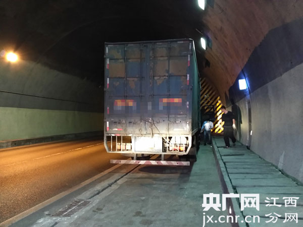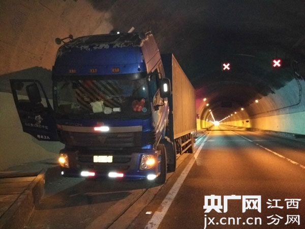 央廣網(wǎng)南昌3月8日消息(吳昊)3月5日16時(shí)許,江西高速交警直屬八支隊(duì)第四大隊(duì)民警,自廈蓉高速公路瑞贛段,瑞金往贛州方向巡邏時(shí),在369km于都東隧道內(nèi),發(fā)現(xiàn)一輛重型貨車(chē)正?吭诤诎档膽(yīng)急停車(chē)帶內(nèi),車(chē)身后方未設(shè)置任何警告標(biāo)志。由于車(chē)身較為龐大,貨車(chē)的一側(cè)幾乎是緊挨著行駛車(chē)道的。當(dāng)時(shí)車(chē)流量較大,而且隧道內(nèi)的道路更為狹窄,一輛輛駛過(guò)的汽車(chē),因未能提前知曉該貨車(chē)?坑诖耍寂c該貨車(chē)“擦肩而過(guò)”,十分危險(xiǎn)。
