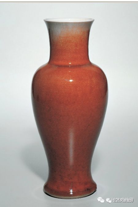 清康熙四十四年至五十一年(1705-1712),江西巡撫郎廷極奉派前往景德鎮(zhèn)御窯廠(chǎng)管理燒造事宜,生產(chǎn)的瓷器中有一種遙仿自宣德的紅釉器,色澤鮮艷,特別引人注目。因是郎廷極監(jiān)造之下的產(chǎn)物,所以稱(chēng)為“郎窯紅”。此瓶形制和觀音手持之凈瓶相似,故又有觀音尊之稱(chēng)。瓶口不規(guī)則的脫釉,則是郎窯紅作品的典型風(fēng)格。觀音尊器形優(yōu)美勻稱(chēng),釉色鮮紅,光彩奪目。此瓶釉質(zhì)純凈肥潤(rùn),玻璃質(zhì)感極強(qiáng)?谘丶暗鬃闾幱幸蝗Π咨吘墸追Q(chēng)“燈草邊”。瓶的內(nèi)壁施白釉,白色純正,類(lèi)雪似銀,與器表的鮮紅色形成強(qiáng)烈的對(duì)比,相映成趣,是一件成功的紅釉之作。