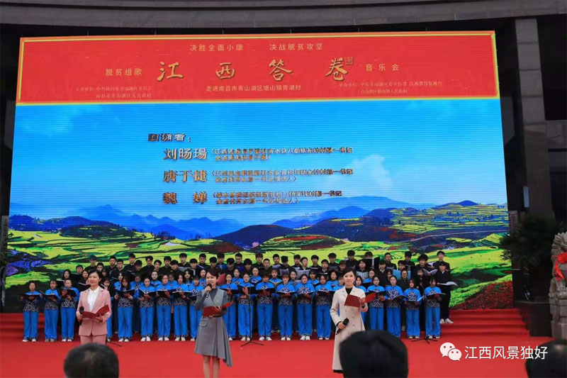 江西是革命老區(qū),曾經(jīng)為中國(guó)革命做出過巨大犧牲和巨大貢獻(xiàn)。江西也是全國(guó)脫貧攻堅(jiān)主戰(zhàn)場(chǎng)之一。全省25個(gè)貧困縣都是重點(diǎn)老區(qū)縣,大部分處于贛南等原中央蘇區(qū)。其中,24個(gè)為國(guó)定貧困縣,1個(gè)為省定貧困縣。2020年4月26日,江西省政府召開新聞發(fā)布會(huì),正式宣布于都縣、興國(guó)縣、寧都縣、贛縣區(qū)、鄱陽縣、修水縣、都昌縣7個(gè)貧困縣(區(qū))脫貧退出,這是我省第四批次貧困縣脫貧退出。至此,全省25個(gè)貧困縣全部脫貧退出,意味著歷史性解決江西老區(qū)群眾絕對(duì)貧困問題,這是我省扶貧開發(fā)史上具有里程碑意義的重大事件。對(duì)此,開場(chǎng)曲《老表的掌聲響起來》生動(dòng)表達(dá)了老區(qū)群眾的激動(dòng)與祝福:“老表的掌聲響起來,映山紅花兒在盛開。脫貧宣言暖民心,決勝小康大步邁!老表的掌聲響起來,千萬顆心兒在期待。鄉(xiāng)村振興奏凱歌,美好生活樂開懷……老表的掌聲響起來!江西好運(yùn)當(dāng)頭,老表幸福常在!”