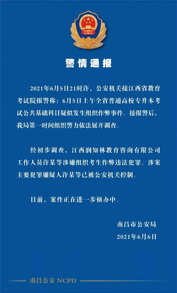 6月5日21時許,南昌市公安局接到江西省教育考試院報警稱:6月5日上午全省普通高校專升本考試公共基礎(chǔ)科目疑似發(fā)生組織作弊事件。接報警后,南昌警方第一時間組織警力依法展開調(diào)查。經(jīng)初步調(diào)查,江西潤知林教育咨詢有限公司工作人員許某等涉嫌組織考生作弊違法犯罪。涉案主要犯罪嫌疑人許某等已被公安機關(guān)控制。目前,案件正在進一步偵辦中。