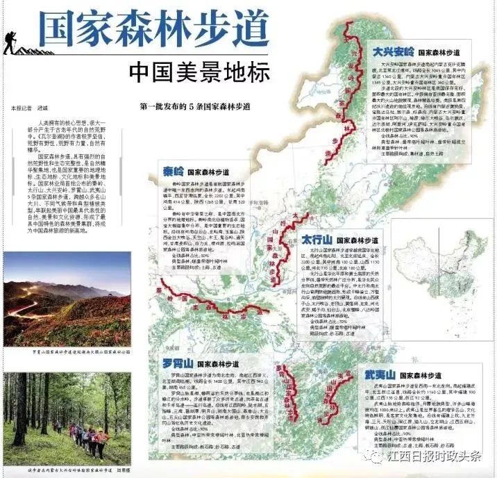 2018年,中共中央、國務(wù)院印發(fā)了《國家鄉(xiāng)村振興戰(zhàn)略規(guī)劃(2018-2022年)》,要求在貧困地區(qū)建設(shè)一批國家森林步道。2019年12月新修訂的《中華人民共和國森林法》明確把“森林步道”納入林業(yè)建設(shè)范疇。國家林草局和各相關(guān)部委把國家森林步道建設(shè)作為自然生態(tài)與人文生態(tài)相結(jié)合的重要抓手,發(fā)布了《國家森林步道建設(shè)規(guī)范》,探索推進(jìn)國家森林步道體系建設(shè)。2017年首批國家森林步道公布以來,我國已公布了3批12條國家森林步道,分別是秦嶺、太行山、大興安嶺、武夷山、羅霄山、天目山、南嶺、苗嶺、橫斷山、小興安嶺、大別山、武陵山國家森林步道,沿線途經(jīng)20個(gè)省份,全程超過2.2萬公里。