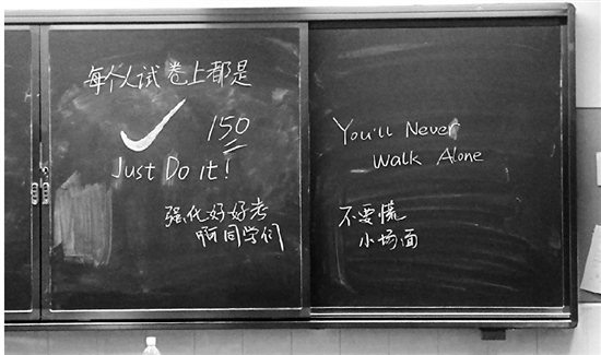 杭四中的休息教室里,老師在黑板上寫下祝福。張雷 攝