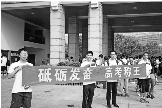 杭二中門口,已經(jīng)保送的幾位同學(xué)打出“砥礪發(fā)奮,高考稱王”的標(biāo)語(yǔ),為同學(xué)們打氣。