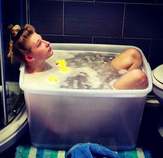 據(jù)英國《每日郵報》近日報道,英國伯明翰大學學生露西萊思(Lucy Lyth)自創(chuàng)新式泡澡,露西把一個容積為145升的塑料箱當作浴缸,體格嬌小的她表示那樣泡澡十分舒服。