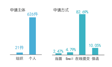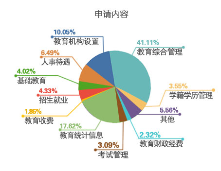 報(bào)告顯示,1月1日至12月31日,共收到公民、法人和其他組織通過各種形式提出的信息公開申請(qǐng)647件,較2014年的281件增長(zhǎng)了130%。從申請(qǐng)的主體看,公民個(gè)人提出的申請(qǐng)626件、其他組織提出的申請(qǐng)21件。從申請(qǐng)方式看,當(dāng)面申請(qǐng)16件,占2.47%;以電子郵件方式申請(qǐng)31件,占4.79%;以紙質(zhì)信函方式申請(qǐng)65件,占10.05%;以在線提交方式申請(qǐng)535件,占82.69%。涉及教育綜合管理的266件,占41.11%;涉及教育統(tǒng)計(jì)信息的114件,占17.62%;涉及教育機(jī)構(gòu)設(shè)置的65件,占10.05%;涉及人事待遇的42件,占6.49%;涉及招生就業(yè)的28件,占4.33%;涉及基礎(chǔ)教育的26件,占4.02%;涉及學(xué)籍學(xué)歷管理的23件,占3.55%;涉及考試管理的20件,占3.09%;涉及教育財(cái)政經(jīng)費(fèi)的15件,占2.32%;涉及教育收費(fèi)的12件,占1.86%;其他36件,占5.56%。申請(qǐng)內(nèi)容涉及教育部20個(gè)業(yè)務(wù)司局。