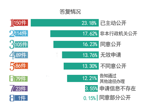 報(bào)告顯示,647件申請(qǐng)已全部按時(shí)答復(fù)申請(qǐng)人,其中“已主動(dòng)公開”的150件,占23.18%;“同意公開”的105件,占16.23%;“同意部分公開”的1件,占0.15%;“不同意公開”的86件,占13.30%;“不屬于本行政機(jī)關(guān)公開”的114件,占17.62%;“申請(qǐng)信息不存在”的23件,占3.55%;“告知通過其他途徑辦理”的79件,占12.21%,無效申請(qǐng)89件,占13.76%)。