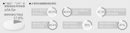 大學(xué)校長都擁有名校學(xué)位,在海外留學(xué)獲取學(xué)位的占30.4%,擁有博士學(xué)位的比例高達89.4%,90.8%的校長是博士生導(dǎo)師,中國科學(xué)院和中國工程院院士占26%。63%的大學(xué)校長理工科出身,其中管理學(xué)背景的校長占10.9%,教育學(xué)背景的校長僅占4.3%。校長所在學(xué)科位列國務(wù)院學(xué)位委員會學(xué)科排行榜中的平均位次為17位,他們大部分是校內(nèi)和學(xué)科領(lǐng)域的權(quán)威,47.3%的校長曾獲得國家級科技獎勵。
