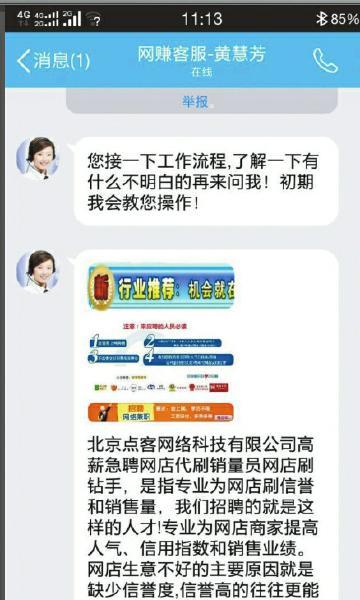 一天前,陳先生登錄58同城網(wǎng)站,向4家公司發(fā)出了兼職意向。當(dāng)天中午,他收到了一份面試邀請的短信,按照提示,添加了客服黃慧芳的QQ號后,一個(gè)女性話務(wù)員的頭像彈出,穿著白襯衣,扎起馬尾,顯得精神抖擻。第一句話便是讓“了解工作流程”,接著,客服發(fā)來一段幾百字的說明。