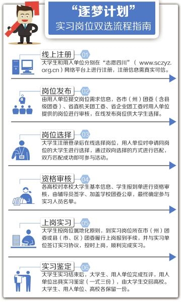 “什么是逐夢(mèng)計(jì)劃啊?”“是一項(xiàng)以在校全日制大學(xué)生進(jìn)機(jī)關(guān)、進(jìn)企業(yè)、進(jìn)金融機(jī)構(gòu)、進(jìn)科研院所、進(jìn)社會(huì)服務(wù)機(jī)構(gòu)、進(jìn)基層開展實(shí)習(xí)活動(dòng)為主要內(nèi)容的社會(huì)實(shí)踐活動(dòng)!眻F(tuán)省委城工部相關(guān)負(fù)責(zé)人說,“為推動(dòng)大學(xué)生就業(yè)創(chuàng)業(yè),引導(dǎo)大學(xué)生通過參與社會(huì)實(shí)踐和職業(yè)體驗(yàn)增強(qiáng)就業(yè)創(chuàng)業(yè)能力,團(tuán)省委、省直機(jī)關(guān)工委、省教育廳、省人社廳、省國資委、四川銀監(jiān)局、省學(xué)聯(lián)繼續(xù)聯(lián)合開展的本年度逐夢(mèng)計(jì)劃!