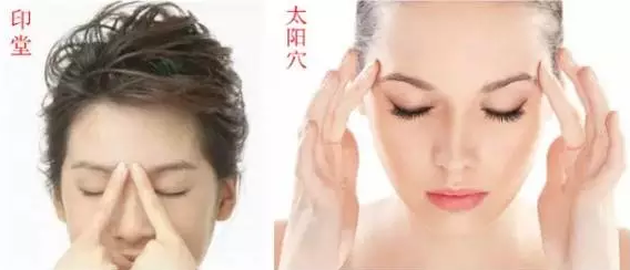 印堂穴,在前額,兩眉頭間的中點。太陽穴,在眉梢旁。