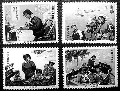 在新中國的紀念郵票上,還有三次展現(xiàn)了人民教師的形象:特13-16《高等教育》上的男教師、J8-13《牧區(qū)小學(xué)》上的藏族女教師、T9《鄉(xiāng)村女教師》中的四位鄉(xiāng)村小學(xué)教師。