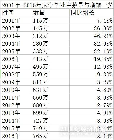 他的感覺在某種程度上是對的,大學(xué)生的“稀缺性”正在不斷降低。2016年10月份,又一輪大四新生將步入找工作的大軍中。這些在2017年即將畢業(yè)的大學(xué)生,預(yù)估總?cè)藬?shù)仍然超過700萬。事實上,從數(shù)據(jù)中可以看出,從上世紀末開始的大學(xué)生數(shù)量快速增長,目前已經(jīng)明顯放緩至年增幅不足3%,但總基數(shù)已經(jīng)到了非常巨大的地步。