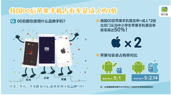 阿凡題報告指出,在擁有手機的00后當中,小米、華為、蘋果順利躋身他們最常使用手機品牌TOP3。更值得注意的是,對比蘋果與安卓手機的出貨量情況,我國00后蘋果手機的普及率已是成人的2倍,在北京門頭溝地區(qū)中小學生蘋果手機普及率甚至高達50%!