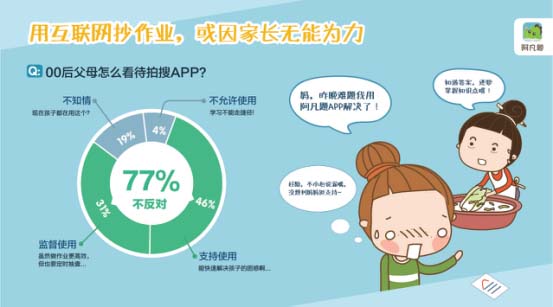 面對00后的作業(yè)難題,更多家長有苦難言,即使他們這一代受大專以上教育水平的人數(shù)比10年前增長近3倍,但是對于輔導孩子功課這件事,依然是力不從心,所以,支持或陪伴孩子使用互聯(lián)網(wǎng)學習工具成為了他們的主要選擇。據(jù)統(tǒng)計,77%的家長不反對使用拍搜APP,其中46%的家長認為“能快速解決孩子的困惑”;而考慮到未成年人自覺性欠缺,31%的家長選擇監(jiān)督和陪伴使用;不允許孩子使用拍照搜題的家長僅為4%。