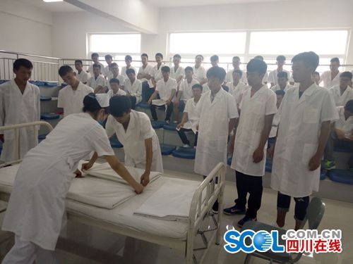 昨(29)日,記者來到四川中醫(yī)藥高等專科學校實驗室看到,教室里滿滿的男生,在老師的指導(dǎo)下,他們正在學習最基礎(chǔ)的課程——準備用物,小小的病床就成了他們的主戰(zhàn)場。