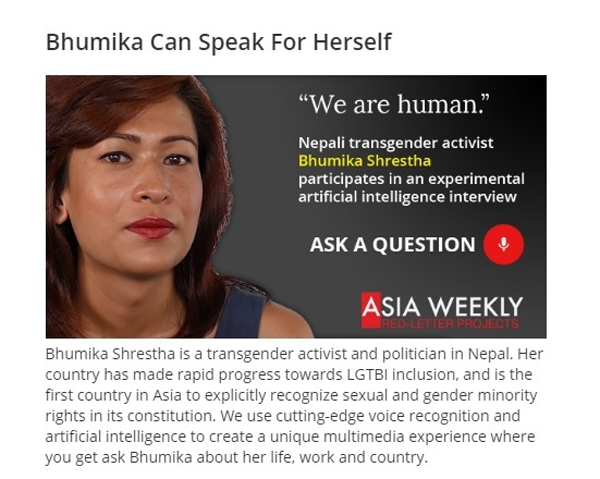 這次視像新聞主角是尼泊爾的一位名叫布米卡的變性者,一個(gè)在南亞備受爭議的新聞人物。尼泊爾的“第三性”運(yùn)動(dòng)使該國成為亞洲地區(qū)第一個(gè)承認(rèn)變性人士合法權(quán)益的國家,該國的護(hù)照相應(yīng)出現(xiàn)了“第三性”性別的選項(xiàng)。布米卡是該國第一位以“第三性”性別身份護(hù)照出國的變性人士。