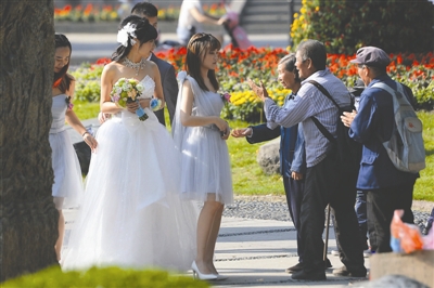 10月1日在合江亭拍照的新人路遇討紅包尷尬。(攝影 王效)